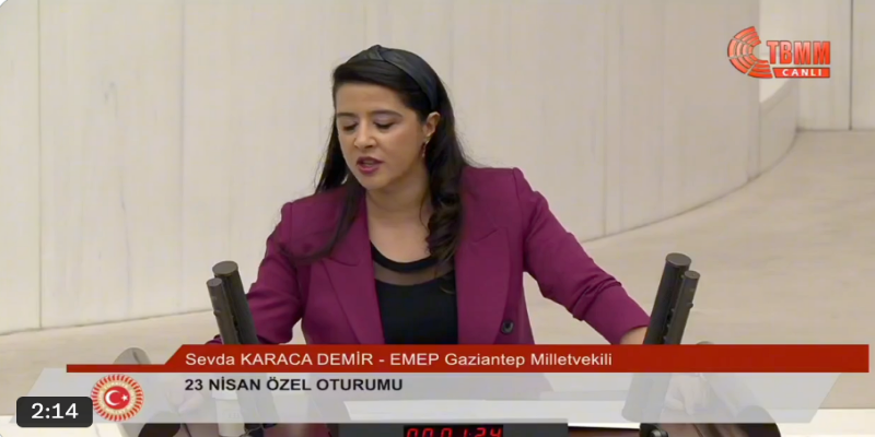23 Nisan Ulusal Egemenlik ve Çocuk Bayramı dolayısıyla TBMM’de düzenlenen özel oturumda söz alan Emek Partisi (EMEP) Gaziantep Milletvekili Sevda Karaca, alışılmış bayram konuşmalarının dışına çıkarak iktidara yönelik çarpıcı eleştirilerde bulundu. Konuşmasına, “Bu kürsüden bir bayram konuşması yapmayacağım” sözleriyle başlayan Karaca, Türkiye’de çocukların maruz bırakıldığı yoksulluk, şiddet, sömürü ve ihmalin üstünü bayramlarla örtmenin mümkün olmadığını ifade etti. “Çocukların yasını tutmadan, milli egemenliği sarayın hizmetine verenlere bir çift laf etmeden bayram kutlanamaz” diyen Karaca, Meclis kürsüsünü bir yüzleşme alanına dönüştürdü.
